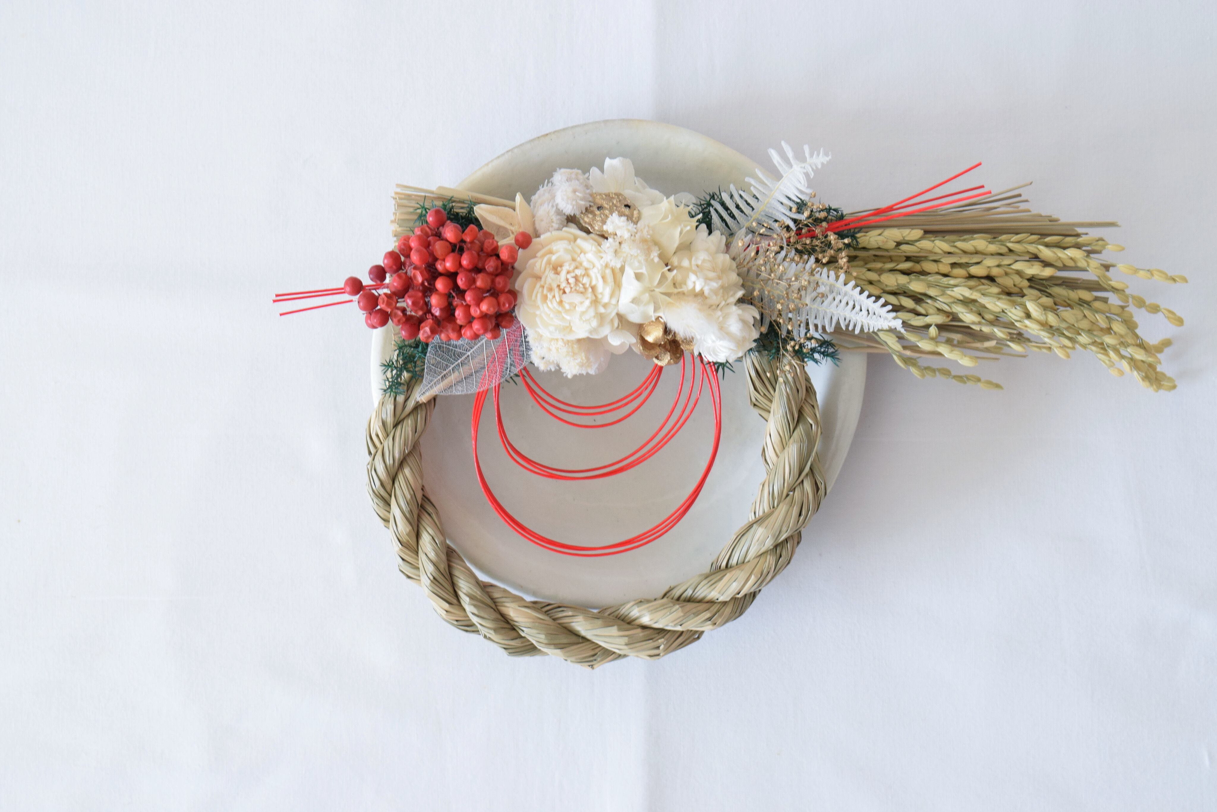 木の実などをあしらったしめ縄リースです。